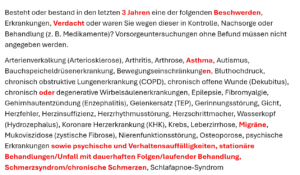 „Besteht oder bestand in den letzten 3 Jahren eine der folgenden Beschwerden, Erkrankungen, Verdacht oder waren Sie wegen dieser in Kontrolle, Nachsorge oder Behandlung (z. B. Medikamente)? Vorsorgeuntersuchungen ohne Befund müssen nicht angegeben werden.“