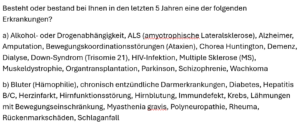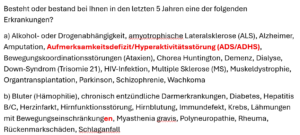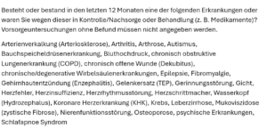 „Besteht oder bestand in den letzten 12 Monaten eine der folgenden Erkrankungen oder waren Sie wegen dieser in Kontrolle/Nachsorge oder Behandlung (z. B. Medikamente)? Vorsorgeuntersuchungen ohne Befund müssen nicht angegeben werden.“